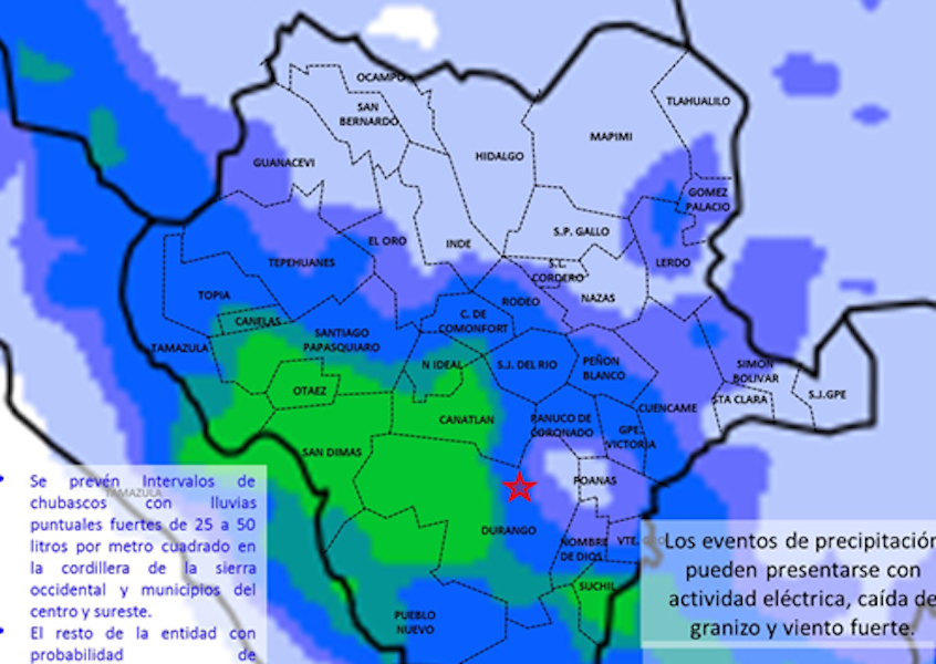 El resto de la entidad con probabilidad de precipitaciones de 5 a 25 litros por metro cuadrado. Los eventos de precipitación pueden presentarse con actividad eléctrica, caída de granizo y viento fuerte.