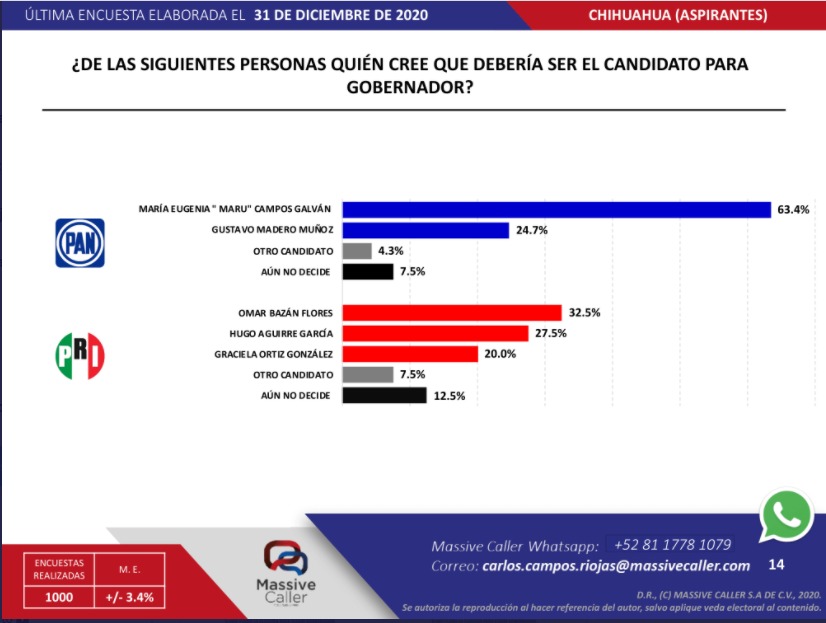 En recientes encuestas de la casa Massive Caller ponen en amplia ventaja a la precandidata del PAN Maru Campos en comparativa con Gustavo Madero.